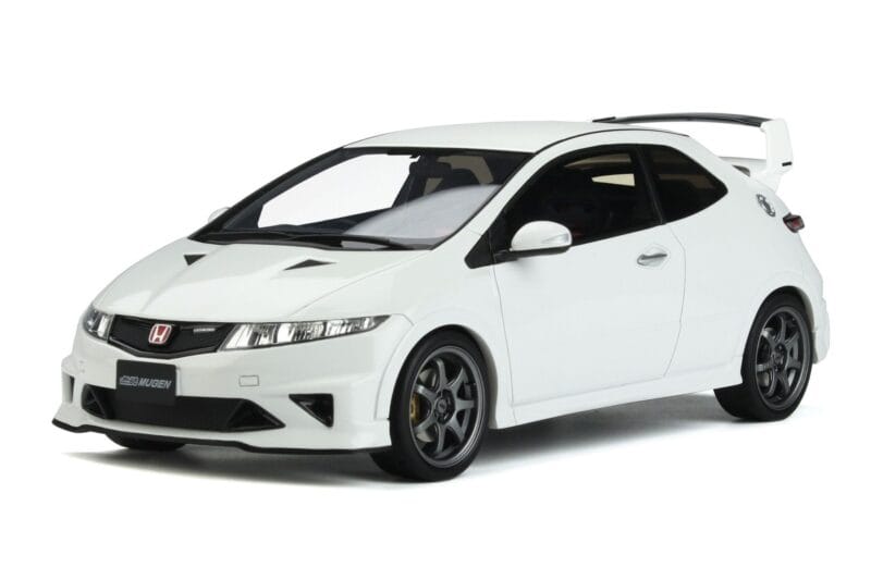 A 1:18 scale model measures approximately 25-28 cm (approximately 10-11 inches). The Honda Civic Type R FN2 Mugen ホワイト Otto 1:18 is perfect for display in a glass cabinet or on a shelf.