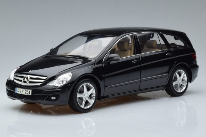 The Mercedes R-Class W251 オブシディアンブラック Minichamps 1:18 is crafted from メタル. Die-cast zinc alloy body with detailed plastic parts, rubber tires, and high-quality paint finish. Die-cast models are known for their weight, durability, and realistic feel.