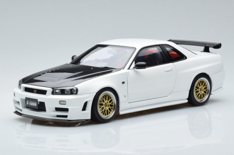 The Nissan Skyline GT-R R34 Nismo Z-Tune ホワイト MotorHelix 1:18 is crafted from メタル. Die-cast zinc alloy body with detailed plastic parts, rubber tires, and high-quality paint finish. Die-cast models are known for their weight, durability, and realistic feel.