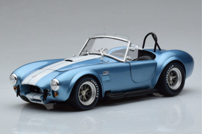 The Shelby Cobra 427 S/C ライトブルー Kyosho 1:18 is crafted from メタル. Die-cast zinc alloy body with detailed plastic parts, rubber tires, and high-quality paint finish. Die-cast models are known for their weight, durability, and realistic feel.