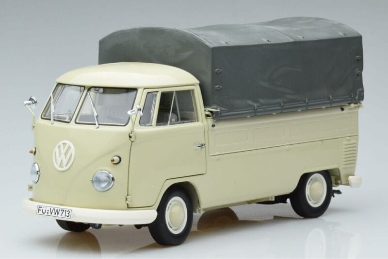 The Volkswagen T1b Pickup Schuco 1:18 is crafted from メタル. Die-cast zinc alloy body with detailed plastic parts, rubber tires, and high-quality paint finish. Die-cast models are known for their weight, durability, and realistic feel.